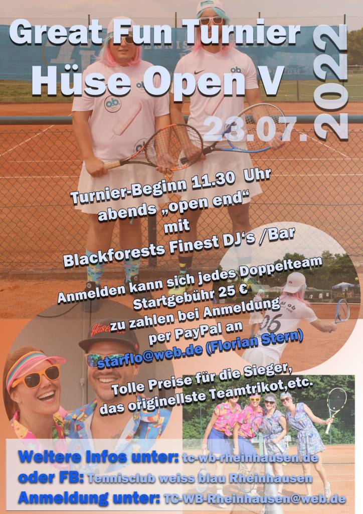 Die zuletzt 2019 durchgeführte Hüse Open (Doppel Fun-Turnier) findet dieses Jahr am 23.07.2022 auf der Tennisanlage des TC WB Rheinhausen statt. Anmeldungen über die Homepage tc-wb-rheinhausen.de oder die Social Media Kanäle.