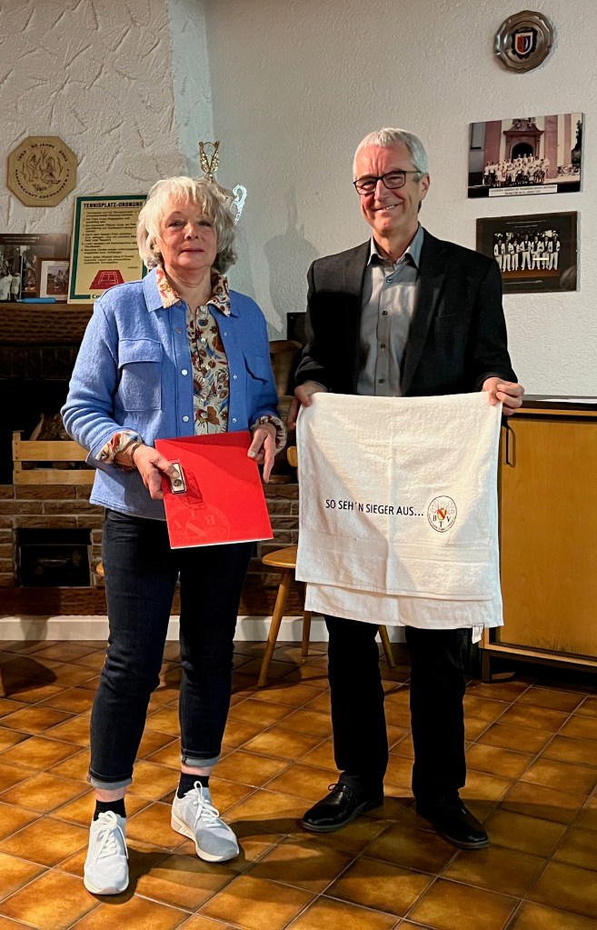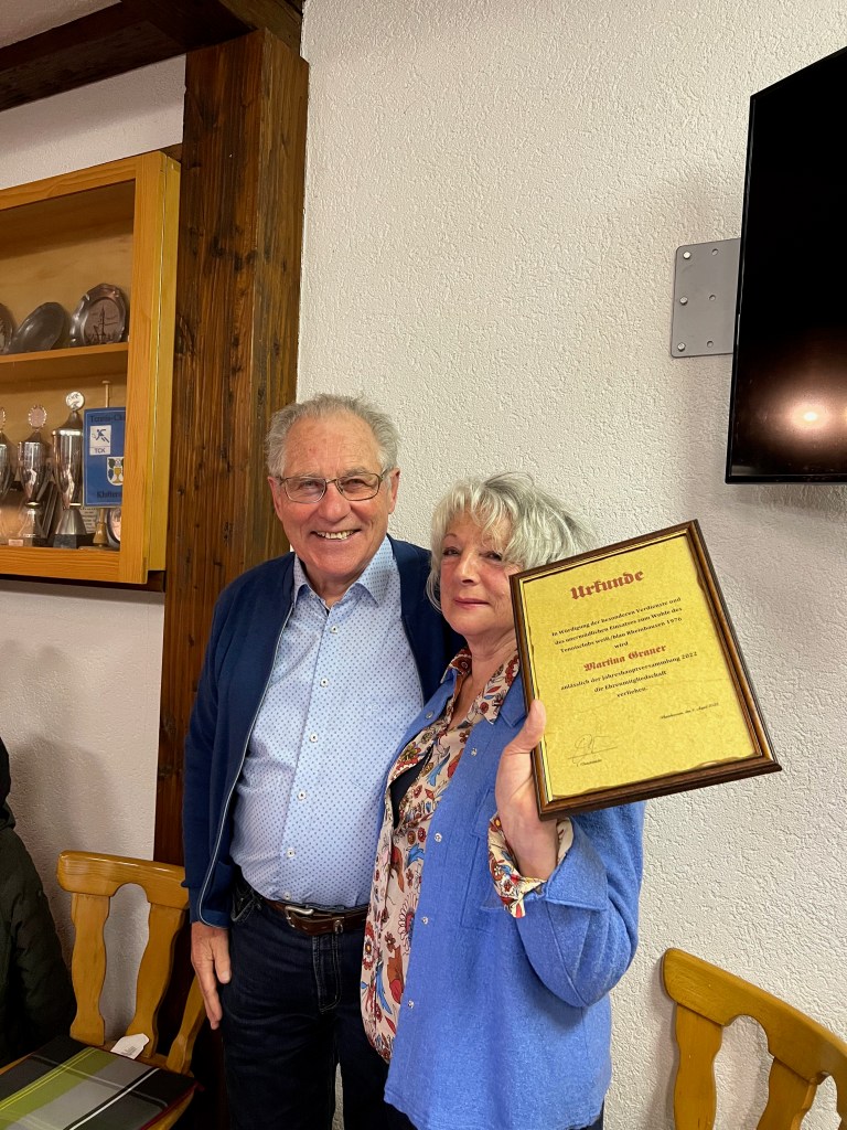 Anschließend wurde Martina Graner, welche 33 !!!! Jahre als Rechnerin des Vereins die Zügel in der Hand hatte und maßgeblich für die finanzielle Stabilität des Vereins Sorge trug, verabschiedet. Auch hier wurde durch den Vorstand ein Präsent des Vereins überreicht. Weiter wurde Martina durch den Bezirksvorsitzenden Edgar Faller mit der silbernen Ehrennadel des badischen Tennisverbandes geehrt. Das Sahnehäubchen gab es dann durch den Ehrenvorsitzenden und ehemaligen langjährigen Vorstand Roland Röthele, in dem er sie zur Aufnahme als Ehrenmitglied des TC der Versammlung vorschlug. Dies wurde einstimmig entschieden, so dass die offizielle Urkunde durch Roland überreicht werden konnte.